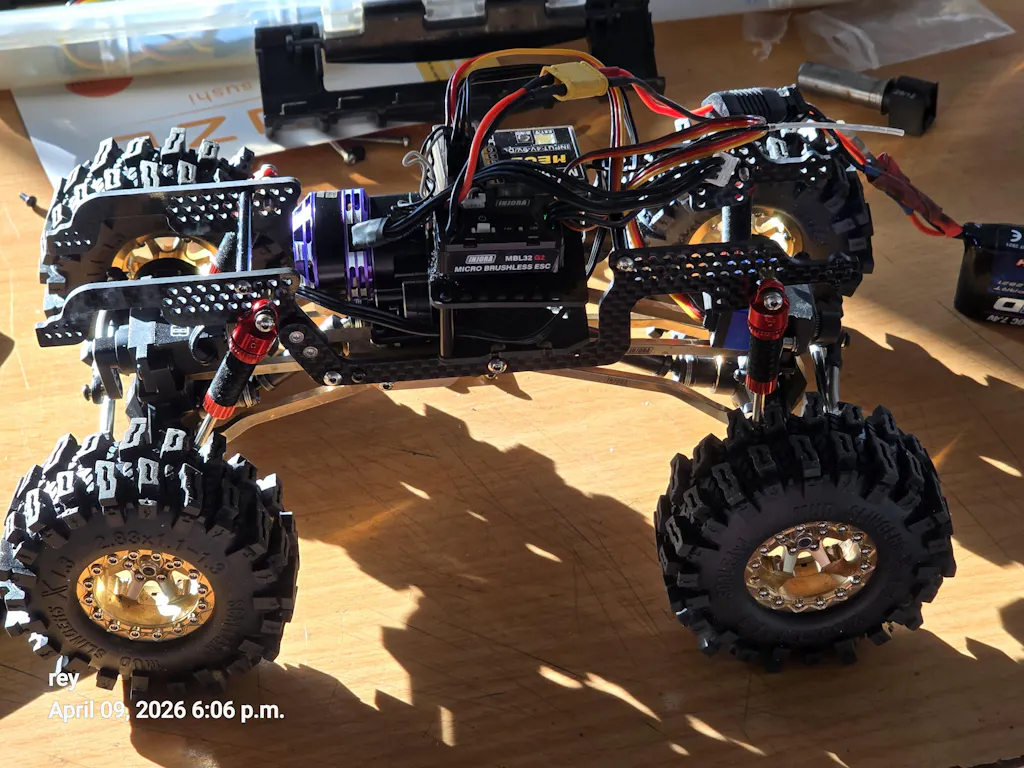 • Brass front axle: The axle housing, steering knuckles, and diff cover are brass. The weight is 123g.