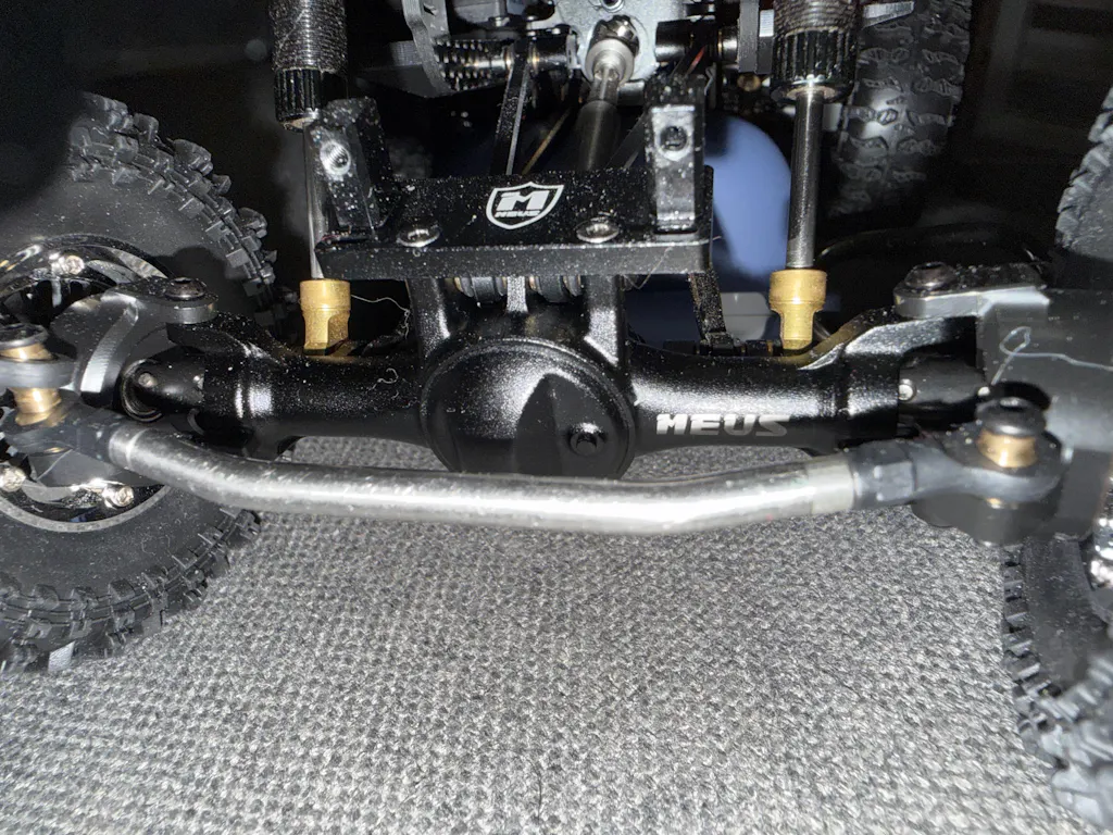 • 4. Front axle weight is 103g, which comes with brass steering knuckles and diff cover, aluminum servo mount and axle housing for overall protection and higher performance while conquering different terrains.